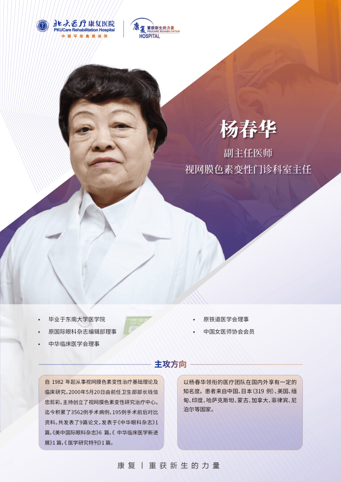近年来,视网膜色素变性是眼科领域的一个罕见病,引起了医学界的广泛关注。针对这一挑战,北京北大医疗康复医院返聘该领域专家杨春华担任眼科负责人,开展针对该疾病的基础理论研究和手术临床实践。作为从事40年视网膜色素变性研究、治疗的专家,杨春华主任在该领域积累了丰富的临床经验和科研成果。